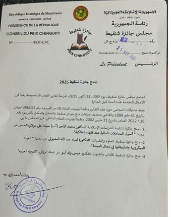 الزمان أنفو (نواكشوط): أعلن مجلس جائزة شنقيط، اليوم الأربعاء، أسماء الفائزين بجوائز الدورة الخاصة بسنة 2025، وذلك بعد اجتماع عقده المجلس أمس الثلاثاء لدراسة تقارير اللجان المتخصصة حول الأعمال المقدمة.