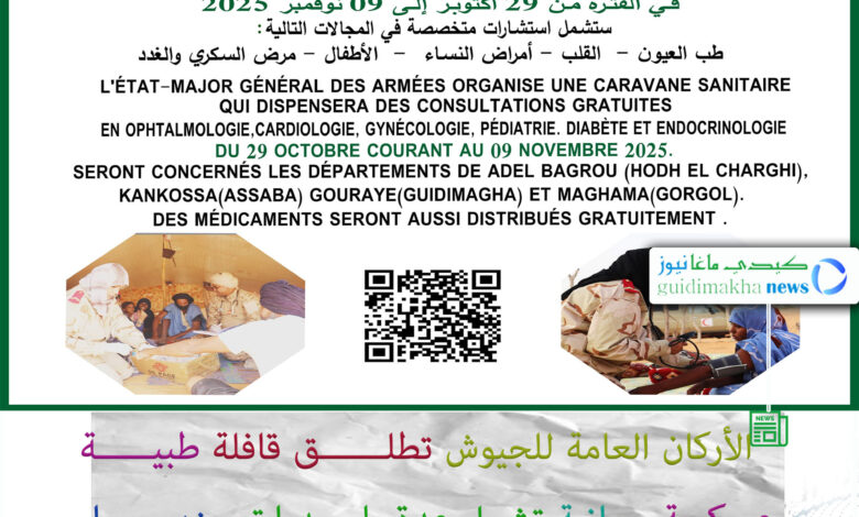 الزمان أنفو (نواكشوط): أعلنت الأركان العامة للجيوش الموريتانية عن انطلاق قافلة طبية عسكرية يوم 29 أكتوبر الجاري، لتقديم خدمات صحية مجانية تشمل الاستشارات والفحوص وتوزيع الأدوية في عدد من البلديات الداخلية، من بينها عدل بكرو، كنكوصة، كوري، ومقامه، وذلك حتى 9 نوفمبر 2025.