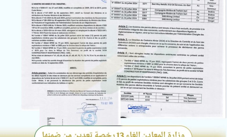 ويأتي هذا القرار في إطار حملة الوزارة لتنظيم قطاع التعدين الأهلي والصناعي، وضمان شفافية منح واستغلال الرخص، وفق المصدر ذاته.