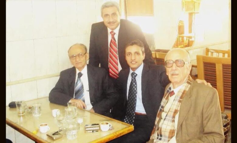 من اليمين إلى اليسار: الشاعر الحلبي الكبير الراحل محمد هلال فخرو، الدكتور الشيخ أحمد ولد دومان، الباحث السوري د. محمد الراشد، والواقف خلفهم الشاعر محمد بشير دحدوح (النابغة الرندي) –