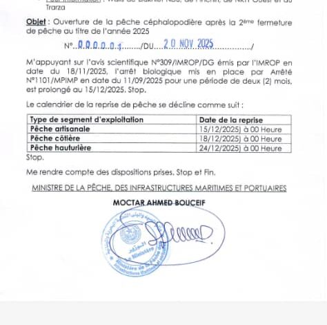 الزمان أنفو (نواكشوط): أعلنت وزارة الصيد والاقتصاد البحري استئناف الصيد ..بالنسبة ل (الرخويات/الأخطبوط) بعد انتهاء الفترة الثانية من التوقيف البيولوجي للعام 2025، وذلك بناءً على الرأي العلمي الصادر عن المعهد الموريتاني لبحوث المحيطات والصيد (IMROP) بتاريخ 18 نوفمبر 2025.