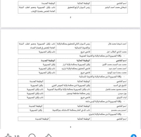 (الزمان أنفو – نواكشوط): أجرى المجلس الأعلى للقضاء، اليوم الاثنين، حركة واسعة شملت تغييرات وتعيينات على مستوى النيابة العامة في عدد من ولايات البلاد.